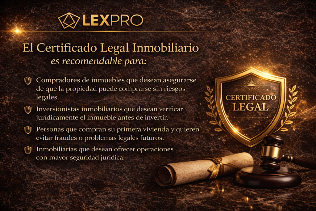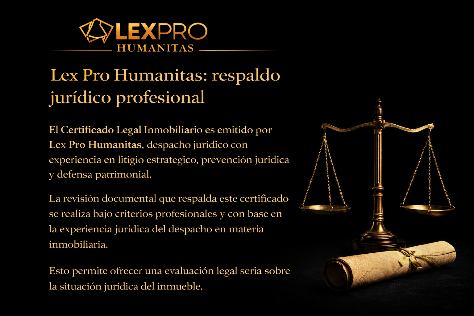 El Certificado Legal Inmobiliario Lex Pro Humanitas es un documento jurídico especializado mediante el cual un despacho legal acredita que un inmueble ha sido analizado jurídicamente y que su situación legal permite realizar una operación de compraventa sin riesgos jurídicos relevantes para el comprador.