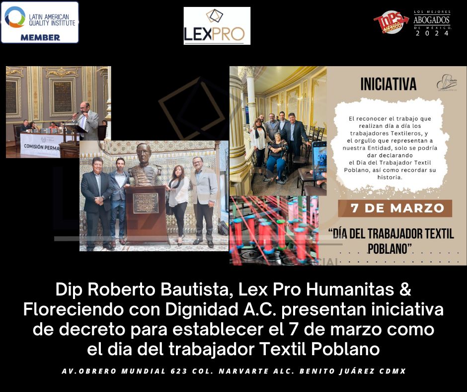 El pasado 9 de mayo, en Lex Pro Humanitas acompañamos al Dip. Roberto Bautista al H. Congreso de Puebla a presentar la iniciativa de decreto mediante la que se establece el 7 de marzo como el dia del trabajador textil poblano.
