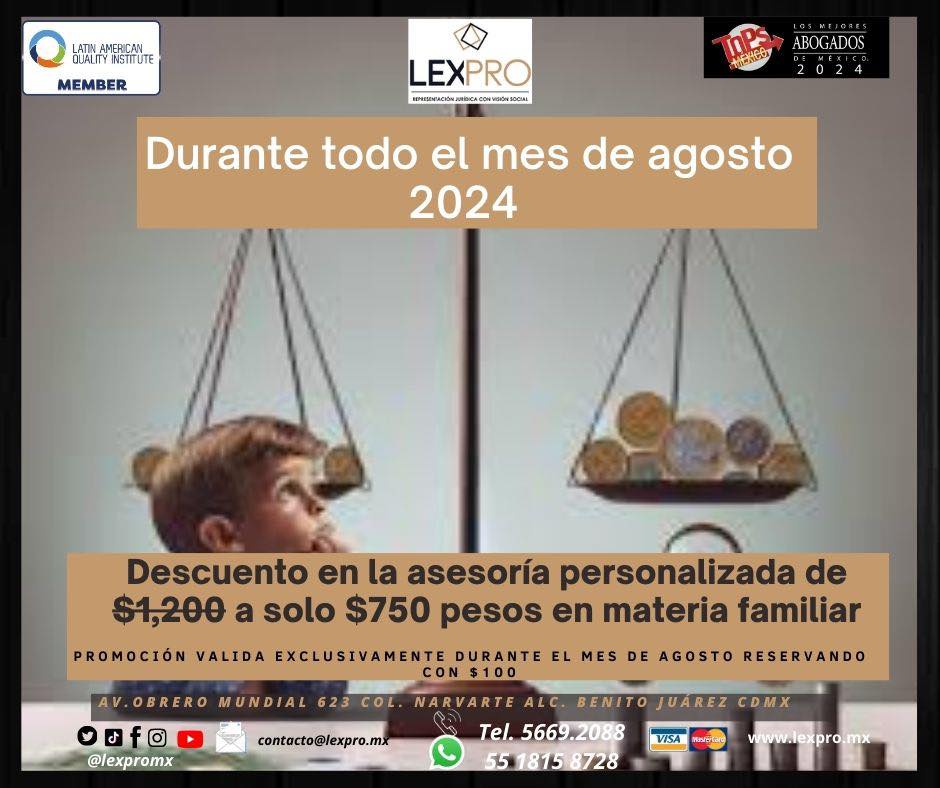 Durante todo el mes de agosto, tendremos descuento en nuestras asesorías personalizadas de $1,200.00 pesos a solo $750.00, y 10% de descuento sobre la cotización de nuestros servicios que se entrega por escrito, esta promoción es valida durante todo el mes de agosto de 2024, el modelo de atención de Lex Pro Humanitas ha sido reconocido como uno de los mejores del país por su efectividad y por que elimina los errores más comunes de la mayoría de los abogados del país como lo son: